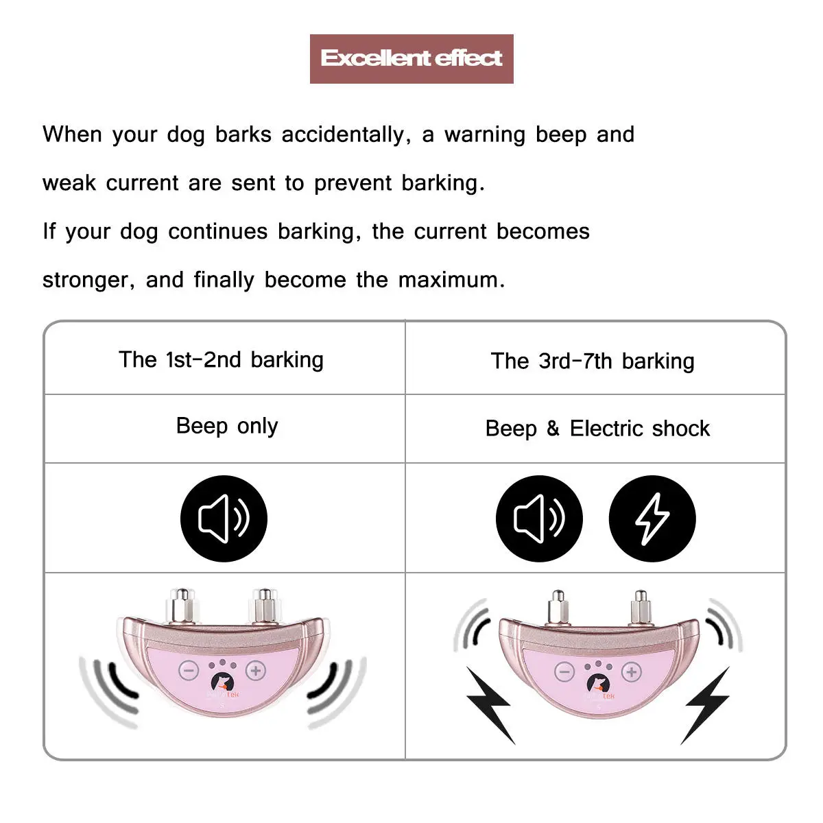 4)The same training will continue 7 times. The first and second times are only alarm sound, and if the dog continues barking, it will trigger the third and seven times alarm static shock. The static shock intensifies every time in order to correct. Don't worry and the static shock won't hurt the dogs .